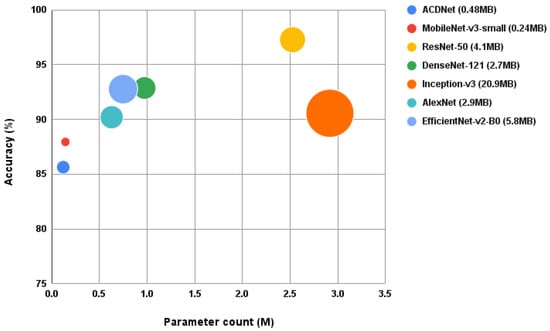 We conducted this comparison analysis using two pipelines, the ACDNet pipeline and the proposed CNN-based pipeline, which is involved with AlexNet, ResNet-50, DenseNet-121, Inception-v3, MobileNet-v3-small, and EfficientNet-v2-B0.