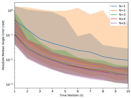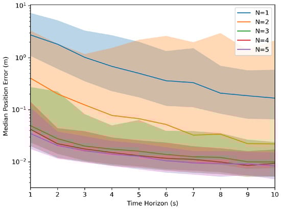 Each parameter combination was simulated with 1000 samples to collect the aggregated information. These simulations generated values of ‘T’ from 1 s to 10 s and an ‘N’ ranging from 1 to 5 robots. The results, as depicted in Figure 2 and Figure 3, indicated that as the time horizon ‘T’ increased, the Euclidean error relative to the target transformation matrix diminished significantly. In the figures below, the median error was used to demonstrate the error over the runs with the light-shaded regions representing the interquartile range of the error. Furthermore, a higher number of robots present led to less variation in the error relative to the target across runs, and the system was less likely to reach an incorrect solution.