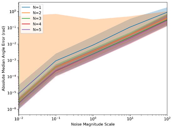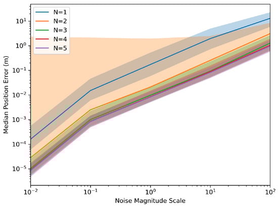 Figure 4 and Figure 5 demonstrate the robustness of the system relative to noise levels. The Monte Carlo simulations were generated again; however, this time, assuming a constant ‘T’ of 10 s and a varying scale of the noise levels listed above at different magnitudes.