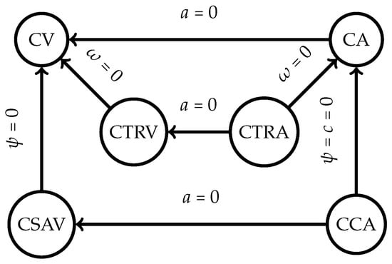 The UKF motion model that this article followed was the constant turn rate and velocity magnitude model (CTRV). This nonlinear motion model assumed that the node could move straight but turned following a bicycle turn model with constant turn rate and linear velocity [35]. Other types of motion models were available, as illustrated in Figure 6. The constant velocity (CV) motion model was the simplest one available, a linear motion model where the linear acceleration was defined to be 0. The constant turn rate and acceleration (CTRA) is an expanded version of the CTRV motion model where the acceleration is accounted for and determined. Similarly to the CTRA motion model, the constant curvature and acceleration (CCA) model replaces the yaw rate of the model with the curvature instead. The constant steering angle and velocity (CSAV) model returns to having the acceleration constant and replacing the assumed constant steering angle instead.