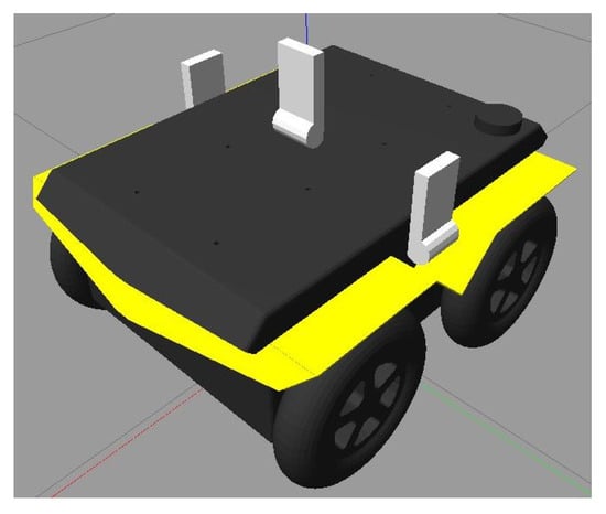The final object was the implementation of the Clearpath Jackals robots depicted in Figure 9 and Figure 10 with two UWB tags on the top of its hood, equally spaced from the center axis of the robot with an extra centrally located UWB anchor. The tags allowed the robot to position itself, while the anchors allowed information propagation to help other robots localize themselves. In this study, it was assumed that the initial position and orientation of the Jackals were not provided. However, an initial estimate could be provided in the initial localization step to improve and reduce the initial position estimate error and thus improve the accuracy. As such, the localization of the Jackal was the main focus of the presented work.