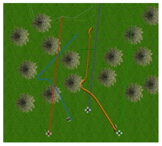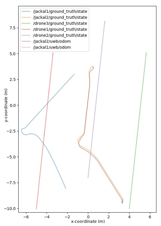 The world consisted of two Jackals and three drones to simulate a mobile surveying endeavor, as presented in Figure 11 and Figure 12. The drones represented the mobile anchors as they flew over the trees and had GPS to help localize themselves with acceptable accuracy. The drones also helped the ground Jackals, who did not have GPS. The process proceeded as such: initially, the drones flew over the trees to achieve GPS localization in a global reference frame; once localized, the Jackals developed their initial position estimation based on the Hector drones. Once the Jackals had localized themselves, they performed their abstract task. Once the task was complete, the drones moved to another location to be surveyed, and the Jackals followed suit. When the Jackals moved to the new location, the drones were too far or obstructed to send UWB range information, so to continue the localization, the two Jackals sent their inter-robot range measurements and used their onboard odometry. Once the Jackals approached the new survey site, the UWB range measurements from the Hector drones helped correct any deviation during the offline path. The simulated noise measurements were based on the empirical data collected from the DWM1001-DEV in range increments of 1 m up to 141 m. The standard deviations of the measurements were recorded. The measurements also included scenarios when the UWB sensor was occluded by thin objects (<25 cm) and thick objects (≥25 cm). The distributions can be found in the Gazebo UWB Plugin https://github.com/AUVSL/UWB-Gazebo-Plugin/blob/master/src/UwbPlugin.cpp (accessed on 3 August 2023).