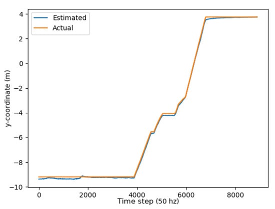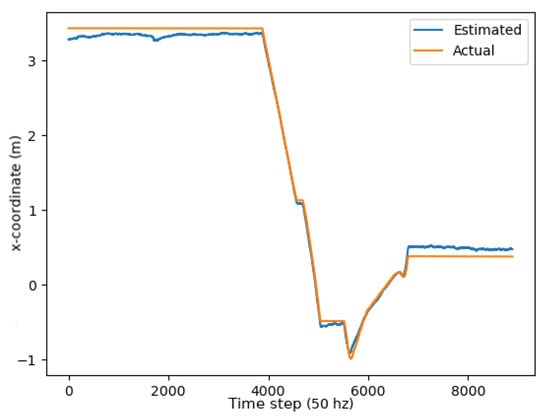 Once the position estimate was calculated, the system transitioned to position refinement techniques to improve further the time-varying sensor noise provided to the robot. The extended Kalman filter (EKF) and the unscented Kalman filter (UKF) have been used extensively in the literature [15,16]. The UKF is sensitive to the inherent time invariant multipath effect and non-line-of-sight (NLOS) noise. To reduce the inherent error, different types of filter approaches have been used [6,10,14,26]. The noise increase was relatively significant for indoor scenarios because so many obstacles could block the direct line of sight of the UWB sensors. As such, using UWB sensors only for localization was not ideal. The noise inherent in the system was reduced, as demonstrated in this research, with the fusion of the wheel encoders and inertial measurement units (IMUs) to smooth out the position estimate.