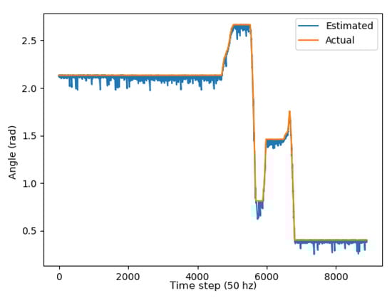 Two metrics were used to determine the accuracy of the unscented Kalman filter: the RMSE (root mean squared error) and mean absolute error (MAE). As demonstrated through the graphs in Figure 13, Figure 14 and Figure 15, the unscented Kalman filter developed for the Jackals follows the ground truth very closely with minimal RMSE values of no greater than 0.10921 m for the positioning errors; however, it could be noted that the unscented Kalman filter had a more significant difficulty estimating the velocity and the yaw rate, with larger errors of 0.24959 and 0.65856 , though due to the difference in scales of the measurement values, this error was deemed to be acceptable. The MAE measurement values were relatively consistent, hovering around between 0.27 and 0.3 , which informs of a possible issue of systematic bias introduced in the system where the position of the system was consistently offset from the actual target. As noticed through the x, Figure 13, and y, Figure 14, position graphs, if noticed closely, the estimated values for the x and y position, when the values seem steady, tend to lag below the ground-truth value. Further tuning of the unscented Kalman filter model’s parameters, such as the sensor noise matrix R, and the sigma point generation parameters and , could increase accuracy in the model. The MAE pose is the average position accuracy, a measure of how close, on average, the position of the robot was to the actual position of the robot using Euclidean distances . Thus, on average, the robot was about 15 cm away from its target position, as noticed by the RMSE, which was often with errors that had lower magnitudes. The confidence error was calculated as the margin of error defined as , where is the level of confidence (1.96 for a 95% confidence interval), was the standard deviation of the variable, and n was the sample size. In Table 1, the confidence interval was calculated using a sample size of five runs.