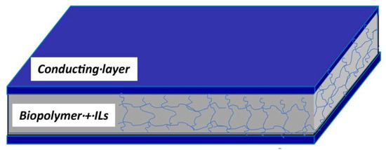 In recent years, the significance of ionic liquids (ILs) has grown, prompting an increasing number of scientists and engineers to explore potential applications for these liquids due to their distinctive physical and chemical properties. ILs possess a distinctive array of properties that position them as crucial candidates for various energy-related applications. Combinations of cations and anions with low volatility, coupled with high electrochemical and thermal stability, as well as ionic conductivity, open avenues for designing ideal electrolytes in batteries, supercapacitors, actuators, dye-sensitized solar cells, and thermo-electrochemical cells [25], and for their use in gel polymer electrolytes for flexible lithium-ion polymer batteries [26]. Moreover, due to their high solubility in water, they possess characteristics that fall within the realm of transient electronics. Some of our previous works investigated the role of ILs in mechanoelectrical transducers based on bacterial cellulose, further highlighting the potential of polysaccharide-based materials in mechanoelectrical sensing [27,28,29].