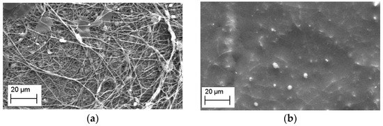 To create the PUL scaffolds, the polysaccharide was dissolved at a 23% w/v concentration in an HPLC-grade water solution. Electrospinning outcomes were influenced by several factors, categorized as solution properties (polymer concentration, molecular weight, viscosity, surface tension, solution vapor pressure, electrical conductivity, and dielectric constant), process parameters (flow rate, spinning voltage, electrode configuration, and electrode distance), and environmental conditions (temperature and humidity). Our experiment utilized water as a solvent, a syringe tip-to-grounded drum collector distance of 9 cm, and a 0.9 mL/h flow rate, resulting in a scaffold featuring nanofibers having an average diameter of 300 nm, rare beads, and some regions where the slow evaporation of the solvent produced flat polymer precipitate, as depicted in the SEM micrograph (Figure 2a). Subsequent membrane soaking with EMIMBF4 induced a morphological transformation evident in the SEM micrograph (Figure 2b). Although a few fibers remained visible, the IL presence manifested as a continuous phase, wetting the fibers and permeating the membrane’s pores.