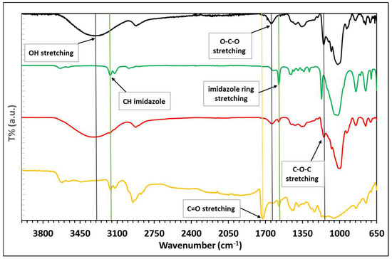 ATR FTIR spectra of PUL (black), EMIMBF4 (green), PUL/EMIMBF4 (red), and PUL/EMIMBF4 /Ag (yellow) samples.