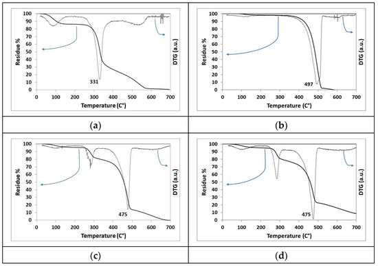 TGA (continuous line) and DTG (dashed line) plots of the PUL membrane as (a) electrospun, (b) EMIMBF4, (c) PUL membrane soaked with EMIMBF4, and (d) soaked membrane coated with silver-based electrodes.