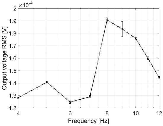 Figure 7 shows the root mean squared (RMS) output voltage of the sensor relative to the excitation frequency. Using the Keysight Technologies 33220A function waveform generator, a sinusoidal waveform of fixed amplitude and varying frequency was applied. The vibration level, approximately 6 m/s2, was measured via the feedback accelerometer PCB333B40-SN51174.