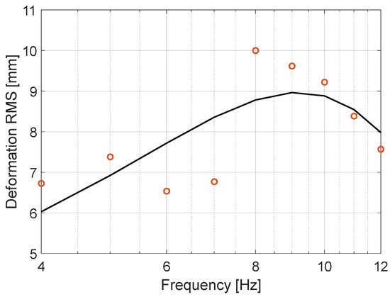 Figure 8 shows the RMS deformation of the device concerning the sinusoidal excitation signal. The deformation measurements relied on the two Baumer 12U6460/S35A laser sensors, calculating the difference between their respective displacements. An observed maximum deformation amplitude of approximately 1 cm coincided with the mechanical resonant frequency of the device.