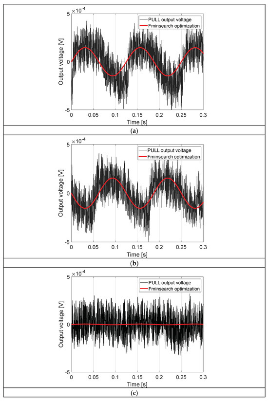 Output voltage of the sensor as a function of the time at (a) 10 mm, (b) 8 mm, and (c) 3.5 mm of deformation, respectively. The graphs include the approximation with a sinusoidal waveform, obtained by using the MATLAB® function fmninsearch.