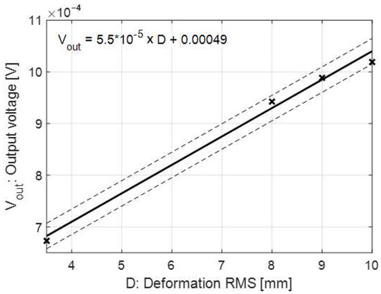 The output voltage of the sensor evaluated in the presence of a sinusoidal vibration at 8 Hz as a function of the applied RMS deformation. Cross marks represent experimental results, dashed lines represent standard uncertainties derived from 10 repetitions.