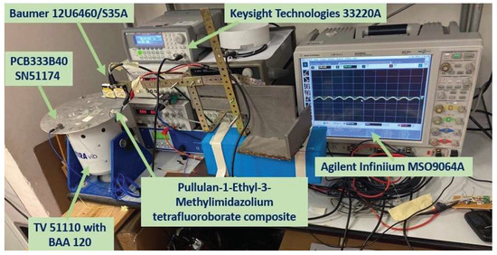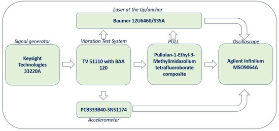 - A Vibration Test System TV 51110 with a BAA 120 power amplifier (max voltage RMS 22 V and max current RMS 5.5 A, with a nonlinear harmonic distortion factor < 0.05%). This system induced motion in the pullulan-based sensor configured as a cantilever beam. Its frequency range spanned 2–7000 Hz, with the main resonance frequency exceeding 6500 Hz and a maximum displacement peak–peak of 13 mm.