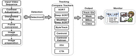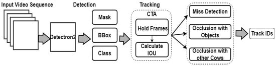 To address these concerns, this research focuses on developing an automatic cattle detection and tracking system that effectively handles occlusion conditions and track-ID increment cases []. By customizing and fine-tuning the Detectron2 model with cow-specific datasets, we aim to enhance the algorithm’s performance in accurately locating and identifying cows, even in challenging environments []. Furthermore, this study conducts an extensive comparison of eight distinct deep-learning tracking algorithms to identify the most optimal approach for precise and efficient individual cattle tracking. Subsequently, we introduce a novel monitoring method tailored for robust cattle detection and tracking in occlusion environments. Our method integrates advanced computer vision techniques, including Detectron2, along with a suite of eight different algorithms, including the CTA. These techniques are specifically designed to detect and track cattle in challenging conditions characterized by frequent occlusions. Our approach innovatively combines Detectron2 with various algorithms, notably CTA, to significantly improve the reliability and accuracy of cattle monitoring in real-world scenarios characterized by occlusions. The key contributions of our study can be summarized as follows: