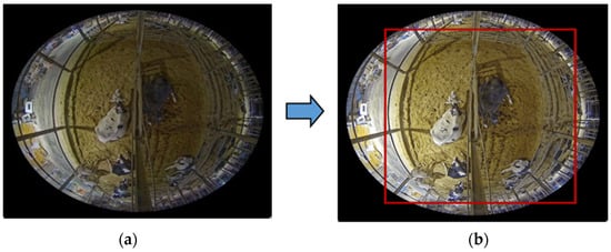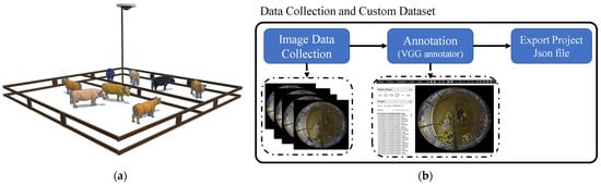 To collect the dataset at the large-scale dairy farm in Oita Prefecture, a 360-degree surveillance camera with a fisheye lens was used. The camera was set to record at a resolution of 2048 × 2048 pixels and a frame rate of 30 fps (frames per second). After collecting these images from the original video, the training and validation images were separated. VGG annotator [] was used to annotate the cow regions. An illustration of the camera setting and the detailed process for data preparation are presented in Figure 2.