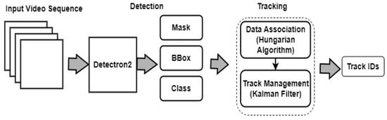 SORT is an online tracking algorithm that is simple and computationally efficient []. It works by first detecting objects in each frame of a video, then assigning a unique ID to each object and tracking it across frames. SORT utilizes the Hungarian algorithm for assigning IDs to the cattle while also incorporating a Kalman filter to estimate the state of each cow over time. Figure 5 illustrates a detailed architecture framework that integrates Detectron2 and the SORT Algorithm.