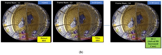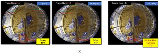 Comparison of miss detection case when using IOU and CTA: (a) IOU algorithm (which cannot solve the ID increment case); (b) CTA (which solved the ID increment case).