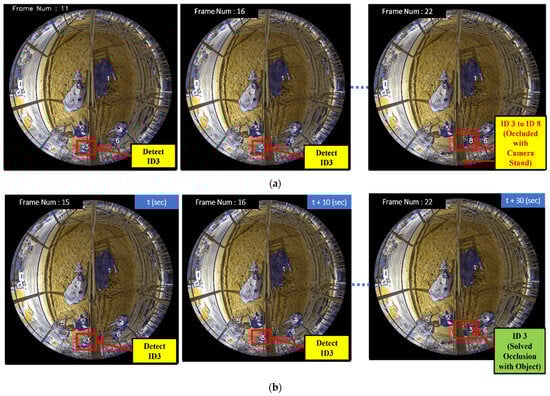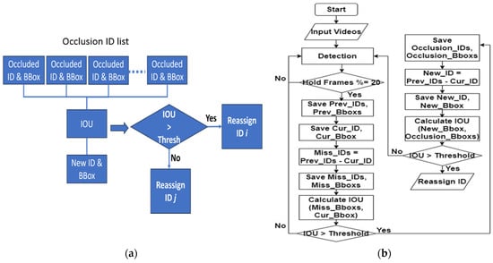 Our CTA exhibits remarkable proficiency in coping with different occlusion scenarios that involve objects like camera stands. Our CTA mainly uses IOU bounding box calculations with a re-ID process. In the case of occlusion with objects, it reassigns the missing ID to the new track and deletes the incorrect track. Here, we assume that n would be 8. Figure 15 illustrates the solving process for CTA—occlusion with objects for (a) logic explanation and (b) flow chart explanation.