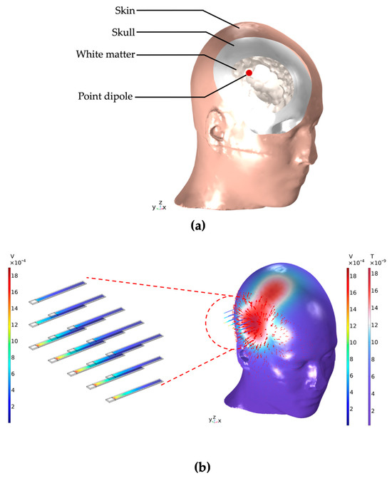 (a) Clipped view of the human head with its tissue regions of skin, skull, and white matter. The white matter region contains an electric current point dipole source—as would be obtained with a deep-brain stimulation electrode—which creates an electromagnetic field. This field propagates through the tissues of the head, through the air environment, and into the ME sensor array. Shown in (b) are the magnetic flux density norm on the head’s surface with corresponding vector arrows and, based on this propagating magnetic field as the method of excitation, the electric response of an adjacent ME sensor array with 15 sensors. The sensors are located at a distance of 1.5 cm from the head and a distance of 1 cm between neighboring sensors. The resulting absolute potential on the surface of each individual piezoelectric layer is shown.