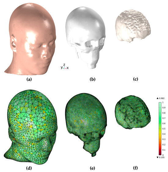 COMSOL Multiphysics geometry and mesh generation of the three tissue regions of the head. (a–c) show the geometry of the skin, skull, and white matter region, while (d–f) illustrate the meshed geometries for those regions in the stand-alone head model.