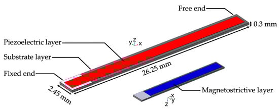 We designed and implemented the ME sensor based on the ME sensor models from our previous work [26,27]. Each sensor consisted of a substrate layer of silicon with 26.25 mm length, 2.45 mm width, and 300 µm thickness, a magnetostrictive layer of FeCoSiB with 22.90 mm length, 1.80 mm width, and 20 µm thickness, and a piezoelectric layer of aluminum nitride (AlN) with 25.60 mm length, 1.60 mm width, and 20 µm thickness. The AlN is polycrystalline, and both the magnetostrictive and piezoelectric layer can be produced for experimental measurements via an in-house magnetron sputtering process [33]. The magnetostrictive and piezoelectric layers were located on the opposite sides of the substrate layer. The thickness of the active layers was chosen at a factor of 10 times higher than that typically used in experimental sensors at Kiel University to reduce the computation time. The sensor operated in resonant bending mode and fixed-free configuration at a resonance frequency of 848 Hz. Figure 3 gives an overview of the ME sensor geometry.