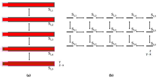 (a) Top-down view and (b) frontal view (on fixed end) of the 15-sensor array. Between each adjacent sensor is a variable distance between 1 mm and 5 cm. This figure shows equidistant sensor placement with 5 mm between the neighbors in both vertical and horizontal direction. The variable distance allowed us to investigate the magnetic crosstalk between sensors and analyze the influence of the magnetostrictive layers on nearby ME sensors.