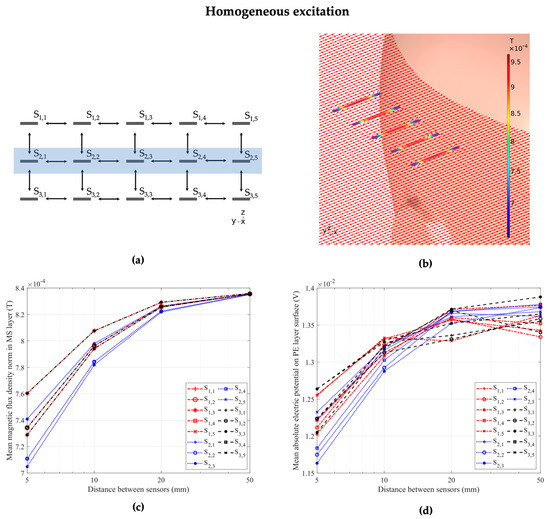 As seen in Figure 7a,b, the ratio between the magnetic flux densities inside the sensor geometry and the corresponding air volumes were not constant with up to two orders of magnitude in the homogeneous and four orders of magnitude in the inhomogeneous case between the ratios at different sensor positions. This large spread showcases the field concentration effect of the magnetostrictive material and highly position-dependent behavior of the sensors. Contrary to the highly variable ratios between the magnetic flux densities, Figure 7c illustrates a narrow range of values between 16.0 and 16.6 for the ratio between electric potential and magnetic flux density for the homogeneous excitation case and any sensor at the investigated array positions and distances. For the inhomogeneous case, Figure 7d shows different behavior between the middle row of sensors (Row 2, S2,1–S2,5) at a distance of 5 mm between adjacent sensors and every other configuration. A factor between 17.4 and 18.0 was calculated for every sensor position, with outliers for the first and last sensor in the second row (S2,1 and S2,5) at a distance of 5 cm exhibiting a factor of approximately 19.0.