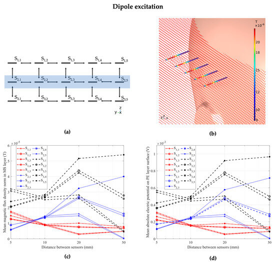 We performed magnetic excitation of the ME sensor array using a homogeneous magnetic field strength of 1 A/m in x-direction applied to the entire model environment. The aim of this study step was to establish and validate the basic sensor response to a simple excitation field and investigate potential crosstalk effects independently of influences of inhomogeneous field effects. Before each array simulation, validation steps were conducted for homogeneous and dipole excitation, i.e., the sensor material parameters were set to those of the air environment in order to eliminate geometric or numeric inconsistencies and validate the magnetic flux density inside the model domain without the presence of high-permeability sensor material. Figure 5a shows a schematic of the full array and highlights the five sensors of the middle row, namely sensors S2,1, S2,2, S2,3, S2,4, and S2,5. We further highlight the exemplary behavior of these five sensors in Figure 5b, where we display the sensors in a homogeneous excitation magnetic field in x-direction and the corresponding magnetic flux density inside the magnetostrictive layer for each sensor. The distance between adjacent sensors was 1 cm. The outermost sensors S2,1 and S2,5 exhibited the highest magnetic flux density, followed by sensors S2,2 and S2,4. The central sensor, S2,3, exhibited the lowest magnetic flux density out of all sensors in the array due to its central position and the resulting crosstalk with its adjacent sensors. Finally, Figure 5c gives a plot of the magnetic flux density norm inside every sensor of the full array with 15 sensors for different distances between adjacent sensors. The previously observed behavior of high crosstalk between adjacent sensors at low distances is clearly visible, while the closer a sensor is to the center of the array, the stronger the effect. At a distance of 5 cm between the sensors, the crosstalk effect is negligible, and all sensors exhibit approximately the same response. At each individual distance between adjacent sensors, the sensor with the lowest magnetic flux density was the middle sensor (S2,3), while the highest flux density was shared between the four corner sensors (S1,1, S1,5, S3,1, S3,5). At the lowest distance of 5 mm, the flux density in the corner sensors was 7.9% higher than in the middle sensor. For the central sensor (S2,3), the magnetic flux density was 15.6% lower at a distance of 5 mm compared to a distance of 5 cm to its neighbors. Notably, the crosstalk effect was significantly stronger with up to 11% for sensors with closely vertically adjacent sensors, compared to horizontally adjacent sensors, based on simulations considering exclusively horizontally or vertically adjacent sensors. For the electric potential, Figure 5d offers similar general behavior for the crosstalk effect based on the electric behavior. Here, while the values converge for all sensors at a distance of 5 cm between neighbors for the magnetic flux density, the electric potential still sees a difference of approximately 4% between the highest (S33) and lowest (S12) at that distance. We expect numerical error to this degree based on the calculation of the fully coupled magnetoelectric effect between the layers as a possibility for the slightly diverging behavior of the electric response of the sensors.