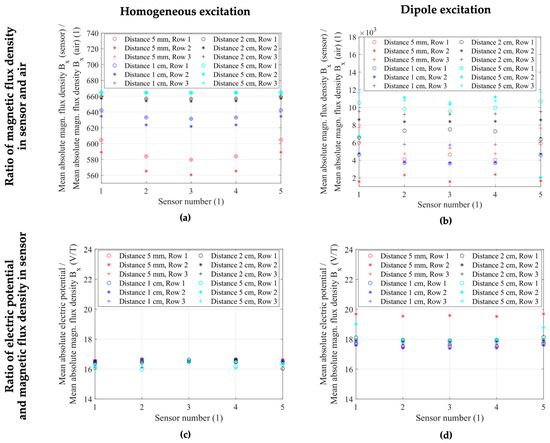 (a,b)The ratio between the mean absolute x-component of the magnetic flux density inside the MS layer geometry for sensor material parameters and sensor material parameters set to air in (a) homogeneous and (b) dipole excitation cases. This ratio is a measure of the field concentration and depends on the sensor position in the array. (c,d) The ratio between the mean absolute electric potential over the PE layer and the mean absolute magnetic flux density component in x-direction in each sensor of the array and for different distances between adjacent sensors. (c) illustrates the near-constant factors between 16.0 and 16.6 for the ratio for each sensor and each position within the array in homogeneous excitation. (d) shows a factor between 17.4 and 18.0 for most sensors, with the outlying second row of sensors (S2,1–S2,5) at the minimum distance of 5 mm between adjacent sensors exhibiting a factor between 19.5 and 19.7.