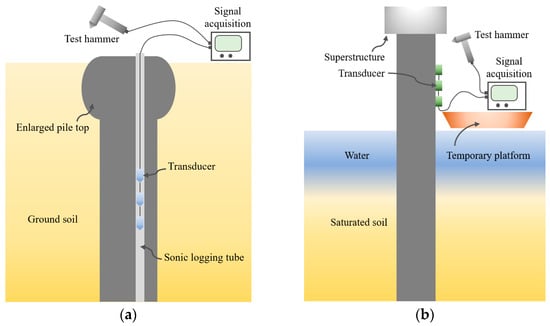 To achieve the installation of multiple sensors at desired depths and make use of existing test techniques, some implementation ideas are proposed for onshore and offshore piles [,,]. For example, as depicted in Figure 1a, if a reinforced concrete (RC) pile is qualified for the cross-hole sonic logging (CSL) test, a series of hydrophones (commonly used in the PS method) can be plugged into one of the water-filled sonic logging tubes located below the known defect (e.g., an enlarged pile top or a detected defect); Figure 1b demonstrates a series of transducers installed along the outer surface of an offshore pile to conduct the MSPDD test, where the sensors below the superstructure can remove the effects of the above structure after signal post-processing (as will be introduced in the ensuing section). For an RC pipe pile, the sensors can be installed on the pile’s inner wall. Even though the installation methods of sensors may be different considering various pile types and service environments, the multiple sensors are generally arranged at a specific depth with equal spacing to receive signals simultaneously. In addition, the receiving direction of the sensors should be consistent with the major direction of the hammer strike.