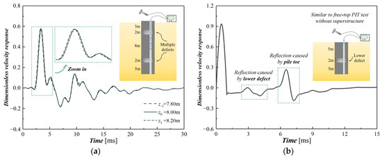 In the MSPDD method, multiple (more than three) equally spaced sensors are installed along the pile shaft in the depth range of interest and are used to simultaneously receive the dynamic velocity responses induced by the test hammer strike. Different from the traditional pile integrity test (PIT) that utilizes only one sensor located at/near the pile top, employing multiple sensors at various depths gathers more information and is more flexible and reliable for complicated testing conditions. Combined with the raveling wave decomposition (TWD) theory [,] developed for equally spaced sensors, the MSPDD results can eliminate the effect of vibration of the structure above the sensors and thus reveal the integrity of the remainder below. Consequently, the MSPDD method and its test results are almost unaffected by shallow defects, enlarged pile tops and superstructures. Therefore, it can be utilized to evaluate piles with multiple defects and extremely long lengths.