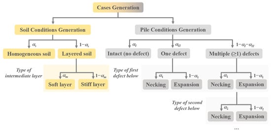 Once the boundary conditions at the pile top and pile toe are determined, the dynamic responses along the pile shaft at various depths can be thoroughly solved. To obtain a better distribution of a sample set and facilitate multi-task learning, the analytical solution-based sample generation is artificially controlled. Figure 4 displays a flowchart of the generation procedure of various cases for analytical analysis, where αI and αII denote the occurrence probabilities of various pile conditions; α1 and α2 are the occurrence probabilities of the type of the first and second defects below the sensors, respectively; and αs and αm are the occurrence probabilities of various soil conditions and type of the intermediate layer, respectively.