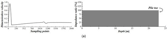 The PFR function contains almost all the mechanics information below the sensors while eliminating the effect of the upper structure. A normalized semi-sine fictitious excitation with a unit amplitude and user-defined duration is then utilized to reconstruct the MSPDD result (as depicted in Figure 2b). This is the same as the result derived from a free-top PIT or lateral PIT [,] applied to a pile foundation that has no superstructure.