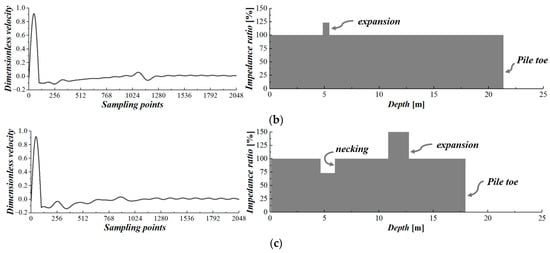 Pile foundations play an important role in onshore and offshore engineering projects. Therefore, it is necessary to evaluate the integrity and quality of pile foundations and thus ensure the safety of supported superstructures. To detect the integrity of reinforced concrete (RC) piles, a variety of non-destructive testing techniques have been proposed successively, such as the low-strain pile integrity test (PIT) [,,,], sonic cross-hole logging (SCL) [,,,] and the parallel seismic (PS) method [,,,,,]. The existence of potential pile defects and unknown pile lengths can be detected by one method or a combination of multiple methods. Meanwhile, these techniques still have certain limitations, e.g., the PIT and lateral PIT [,] methods are convenient to implement, however the results may not be as reliable in the case of shallow and multiple defects, where the pile toe reflection is inevitably affected by the defect above. Similarly, the SCL test can be conducted along the entire length of the pile, but it only examines the area between the sonic logging tubes and cannot reflect the actual mechanical information of the pile cross-section. The PS results incorporate the whole mechanical information of both the pile and the surrounding soil, but the test requires significant preparatory work, which increases the cost. At the same time, most of these methods rely heavily on the operators’ experience, which is not conducive to automatic identification.