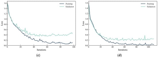 Iterative learning procedure of loss function considering number of samples: (a) 1000; (b) 2000; (c) 4000; (d) 8000 (loss function is expressed in Equation (14)).
