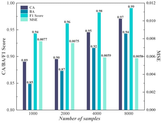 Consistent with the tendency of the loss function, CA, BA and F1 Score values increase and the MSE value decreases as the sample size increases. Fortunately, benefiting from the proposed multi-sensor detection method as well as the multi-task learning framework, the accuracy metrics for small samples (e.g., 1000 in this case) are also satisfactory. Comparing CA, BA and F1 Score values, it is worth noting that the recognition accuracy of Class I is better than the Categorical Accuracy of multi-class (Class I, II and III), and both are better than the defect-type classification accuracy. This is due to the sequential relation between multiple tasks, where Task 2 is conducted based on the sub-task of Task 1 (i.e., Task 1-I), while Task 3 is conducted on the basis of Task 2. Although errors from the previous task are passed on to its subsequent task, this scheme also follows the priority of the detection order in an actual project. For the purpose of only identifying whether there are defects below the sensors (i.e., Task 1-I), even a small sample set (e.g., 1000 in this case) can obtain an excellent recognition accuracy (F1 Score = 0.94) based on the hybrid model. Furthermore, if the number and type of defects need to be determined in some cases, a larger sample size is required (≥4000 in this case) to obtain satisfactory CA (≥0.95) and BA (≥0.92) values.