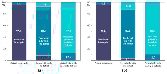 So far, the output layer of size 5 neurons has been integrated to describe the actual pile quality below the sensors. Table 1 provides some examples of descriptions of output labels. Moreover, if the exact number or specific conditions of multiple defects need to be determined in some cases, it can also be achieved by continuing to lower the sensor position and repeating the MSPDD test. Multiple defects can then be detected one by one from top to bottom. However, in most cases, an RC pile with multiple defects will be directly evaluated as the worst class according to the Chinese Technical Code for Testing of Building Foundations Piles [].
