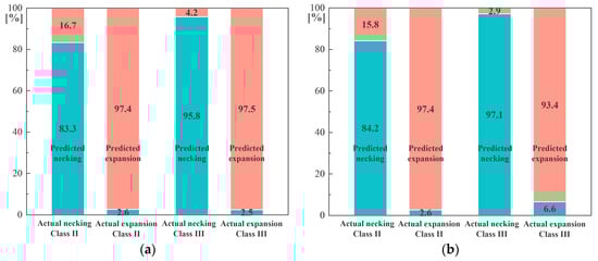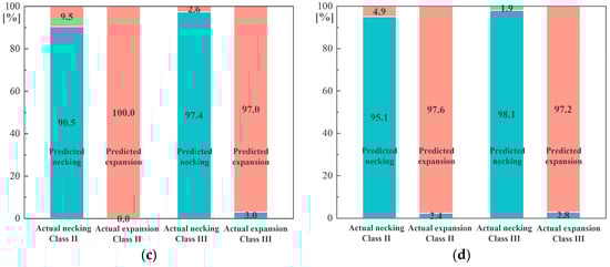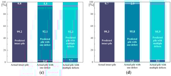The performance of the hybrid neural network in Task 2 is demonstrated in Figure 9a–d. Similarly, the recognition accuracy of defect type increases as the sample size becomes larger. If we take the overall recognition accuracy over 95% as the standard, it is appropriate to construct a sample set of more than 4000 samples to conduct this task. It is also noted that the type recognition of the defect of Class III performs better than that of Class II, while the accuracy of expansion recognition is also higher than that of necking recognition. The reason for this phenomenon may be that the reflection caused by a necking defect is confused with the pile toe reflection for friction piles, especially when there is only one defect between the sensors and the pile toe.