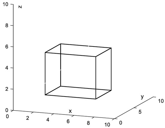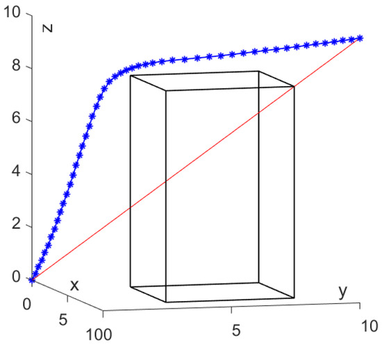 For discussion convenience, a cuboid obstacle is introduced and the fixed iteration step length is used for the simulation conducted in a 3D space with X ∈ [0, 10], Y ∈ [0, 10], Z ∈ [0, 10]. The cuboid obstacle vertex is set as {(3,3,0), (3,8,0), (8,8,0), (8,3,0), (3,3,8), (3,8,8), (8,8,8), (8,3,8)}. The red line is a straight line from start to end. The mobile agent is assumed to move from the start point (0,0,0) to the goal point (10,10,10), as shown in Figure 4a. Figure 4b illustrates the collision energy distribution of the cuboid obstacle.