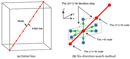 Different from other search algorithms, a six-direction search (SDS) algorithm is proposed in 3D space to lessen the path search computation, as shown in Figure 3b. By setting the search step length , for the i-th node, the SDS can be obtained as follows: