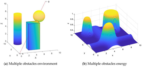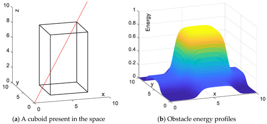 In this section, to further validate the effectiveness of the SDS scheme, multiple obstacles are considered in the 3D environment. Three obstacles are set typically as a cuboid, a cylinder and a sphere. In detail, the vertex, cylindrical base center or sphere-center coordinates of the obstacles are {(3,2,0), (6,2,0), (3,4,0), (6,4,0), (3,2,7), (6,2,7), (3,4,7), (6,4,7)} for the cuboid obstacle, {(2,8,0), r = 1, h = 8} for the cylindrical obstacle and {(7,7,7), r = 1.5} for the sphere obstacle, respectively. It is assumed that the mobile agent starts moving from the start point (0,0,0) and stops at the target point (10,10,10), as shown in Figure 13a. Figure 13b shows the energy of the obstacles.