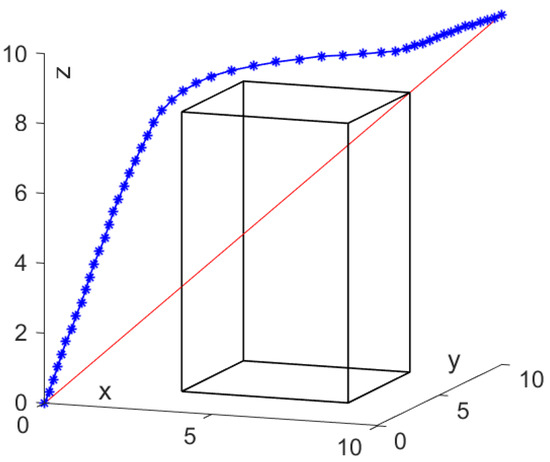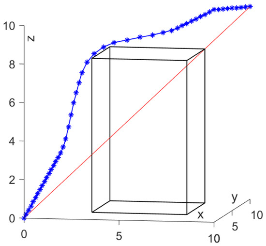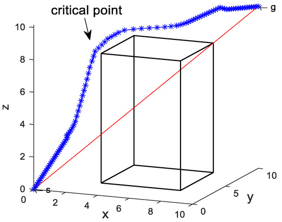 To improve this phenomenon of early convergence, a smaller iteration step length = 0.01 is employed to further validate the SDS scheme, and the result is shown in Figure 7. As seen from Figure 7, the generated path can reach the target point without collision and the critical point does not closely approach the cuboid obstacle, which makes the path more feasible in practice.