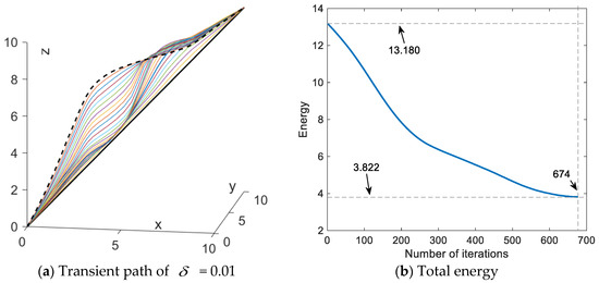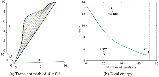 Figure 8 illustrates the transient paths and their total energy variations. In case δ = 0.01, the total energy decreases from an initial state of 13.180 to a final state of 3.822 with 674 iterations. Compared to the δ = 0.01 case, with δ = 0.01 employed, the number of iterations increased by 836.1% but the total energy decreased by 22.3%, and the scheme generated a smoother path. These results can confirm that premature convergence can be improved by reducing the iteration step length. However, it is worth noting that reducing the iteration step length will greatly increase the number of iterations and the amount of computation will also increase a lot.