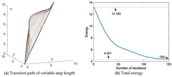 Figure 10 describes the transient profiles and total energy variations for the corresponding paths. The collision energy decreases as the number of iterations increases and the variable step length also becomes smaller as the collision energy decreases. As can be seen from Figure 10b, the total energy decreases from the initial state 13.180 to the final state 4.401 with 150 iterations. Compared to the fixed δ = 0.1, the scheme increases the number of iterations by 108.3%. Additionally, it decreases the total energy of the final convergence point by 10.6%. On the other hand, compared to the fixed δ = 0.01, it decreases the number of iterations by 77.7% and increases the total energy of the final convergence point by 15.1%. This situation implies that employing variable step length significantly diminishes the number of iterations and can improve premature convergence. However, the results of this approach are not satisfactory.