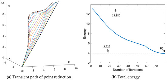 In Figure 12, the transient profiles and variations in total energy are presented for the corresponding paths. It can be seen that the total energy decreases from the initial state of 13.180 to 3.927, which is closer to the total energy of 3.822 in the = 0.01 case. Compared to the variable step length scheme, this scheme reduces the number of iterations by 46.7% and the total energy of the final convergence point by 10.8%. The data reveal that the reduced path node scheme requires a lower number of iterations compared to the previous schemes. Additionally, it demonstrates a significant decrease in total energy when compared to Figure 6b and Figure 10b, and it can effectively improve the premature convergence.