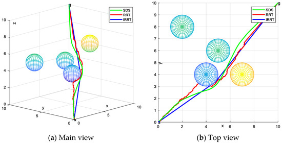 Remarks. For the purpose of this paper, to verify the feasibility of the proposed search scheme, the SDS algorithm is analyzed in comparison with the traditional RRT algorithm and the IRRT algorithm that was proposed in the literature [11]. Both the RRT algorithm and the SDS algorithm are comparable as they obtain new nodes by utilizing a node expansion strategy and find the final path after several explorations and expansions. Figure 15 shows the optimal paths obtained by the SDS, RRT and IRRT algorithms in the same case, with the start and goal points represented by the green and blue balls, respectively. As can be seen from the figure, in the same situation, the paths generated by all schemes can avoid obstacles to reach the target point. Compared to the paths generated by the SDS and IRRT, the RTT path is smoother. The proximity between the paths generated by RTT and IRRT and the obstacles creates a risk of collision. But the path generated by SDS is a certain distance from the obstacles, which does not generate a risk of collision and it is more in line with the requirements of the actual situation.