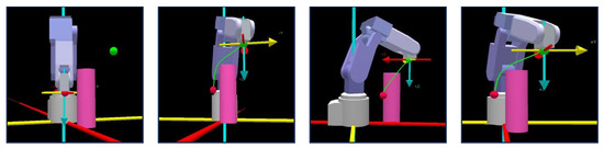 The physical experiment verification includes two parts: physical robot model simulation and physical robot verification. The experiment is conducted on a Mitsubishi six-degree-of-freedom robotic arm RV-2F-D. The unit of each parameter in the experiment is in millimeters (mm). The starting coordinates of the robot end-effector (i.e., the red ball location) are (150,−50,170), and the target coordinates (i.e., the green ball location) are (350,150,370). For illustration convenience, only a cylindrical obstacle {(250,50,0), r = 20, h = 290} is set in the experimental space. To verify the path generated by the SDS method based on the simulative robotic arm RV-2F-D model, the final path nodes optimized by the SDS algorithm are input into the Mitsubishi robotic arm simulation software GX simulator. Then, the robotic arm performs path following, and the actual path is shown in Figure 16. From Figure 16, it can be seen that the robotic arm can follow a smooth path with obstacle avoidance. These simulation results verify that the scheme of the SDS algorithm is effective and feasible.
