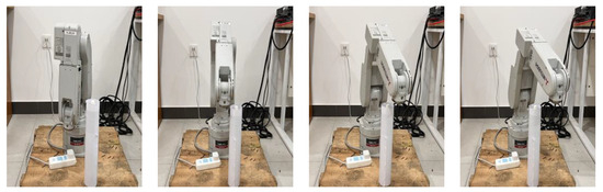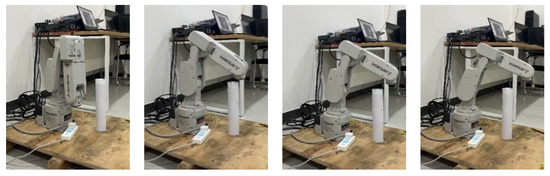 To further validate the feasibility of the SDS algorithm, a physical experiment is conducted on the robotic arm RV-2F-D. Figure 17 and Figure 18 illustrate the transient profiles of the robotic motion from the front and side views, and it can be seen that the robotic arm successfully performs the path-tracking task without any lag. These results demonstrate that the path can be followed smoothly by the robotic arm and is suitable for physical applications.