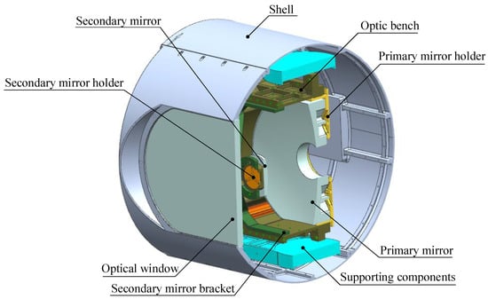 Figure 1. The primary mirror and secondary mirror are mounted on the primary mirror holder and secondary mirror holder, respectively, and they are connected through the optic bench and secondary mirror bracket to form the main body of the reflective opto-mechanical structure. The opto-mechanical structure is connected to the shell of the EO through supporting components and is surrounded by a cabin formed by the shell and the optical window, which is usually cylindrical or spherical.
