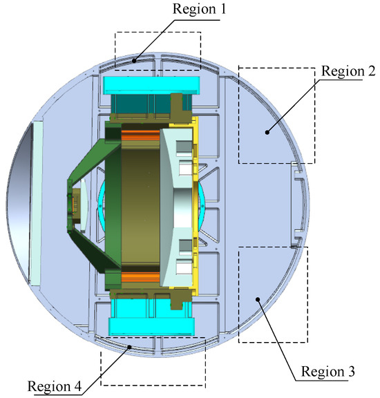 −5 Ω/°C. The heat generated by the heating film is evenly distributed on the heating cover, heating the opto-mechanical structure in a radiative manner. The heating film works with the temperature sensor. The temperature sensor is accurate to ±0.5 °C and has an operating temperature range of −55 °C to 125 °C; it is bonded to the back of the heating cover and measures the temperature. In addition, considering that convection inside the cabin leads to high temperatures in the upper part and low temperatures in the lower part, active heating is divided into multiple zones, with each zone having independent power control, as shown in